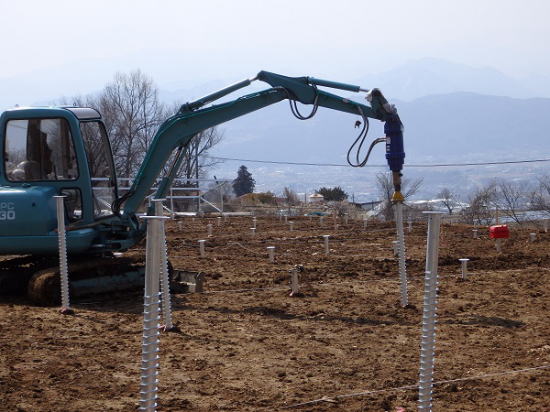 まず整地を行い、その後、ユニックの先についたドリルを回転させながらスクリュー杭を打ち込んでいきます。